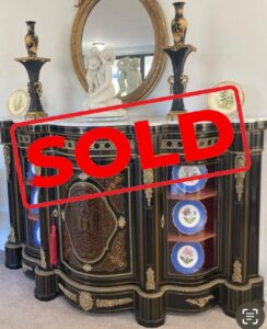 Rare mid 19th century Ebonised serpentine shape credenza with Carara marble top; classical gilt metal mask head mounts (signed at rear); Boulle work brass and exquisite tortoiseshell marquetry centre door.