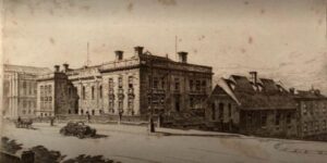 Framed Austin Platt etching of Sydney Grammar School showing both a car and horse and cart. Some foxing. C1920s