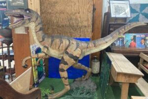 Remy the Jurassic Raptor dinosaur took 145million years to get to The Vintage Place but is now happy to have his photo taken with you for $10 and will give you a certificate to prove you met him.