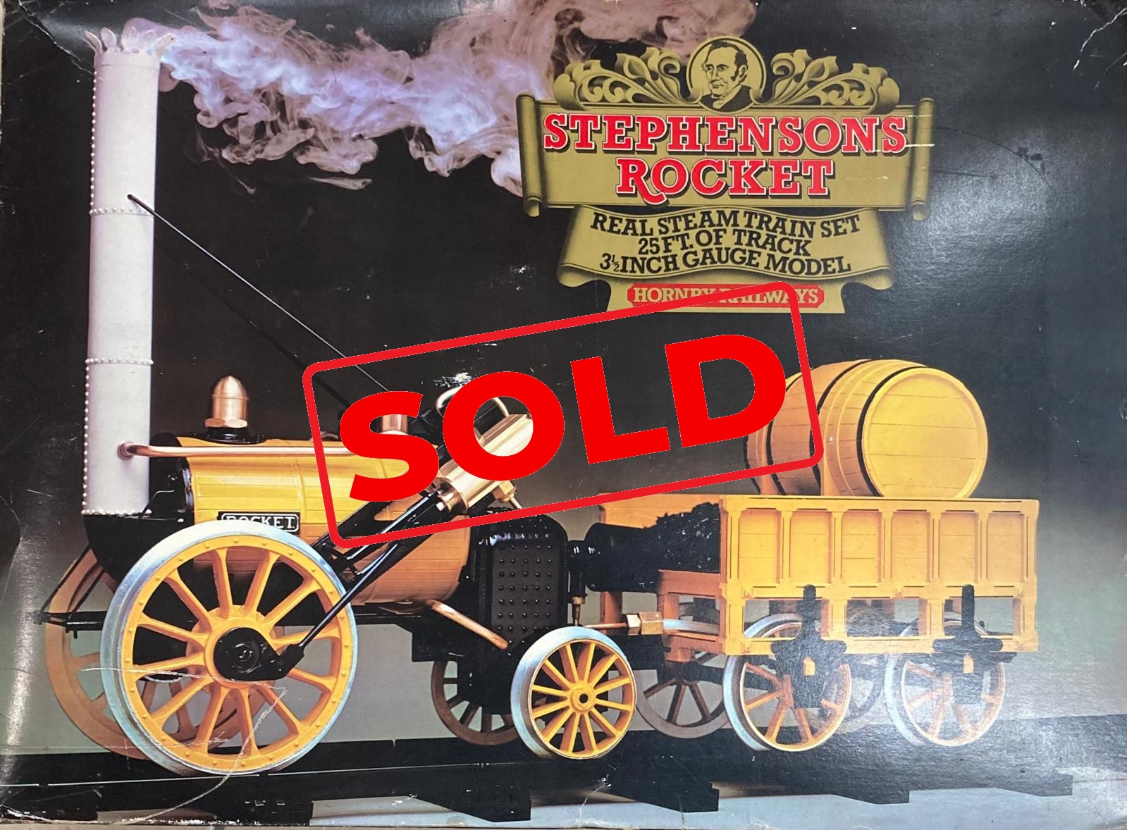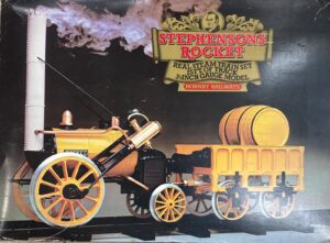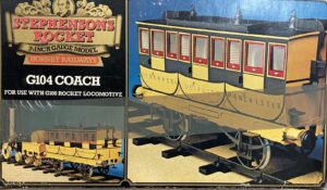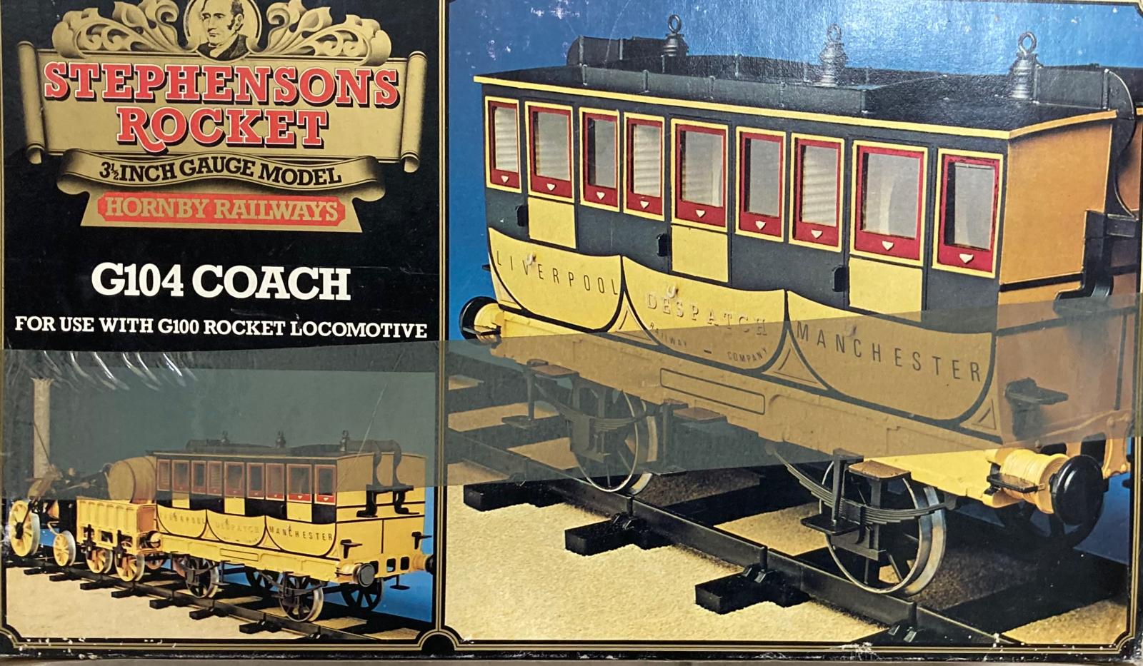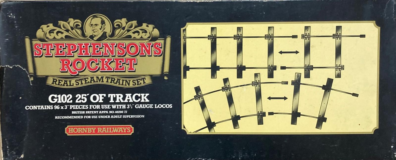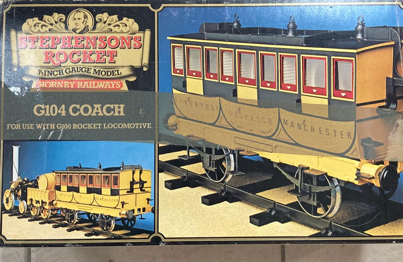 Large set of Hornby Stephensons Rocket 3 1/2 inch gauge with steam, carriages and rails in original boxes as used briefly in the 1970s